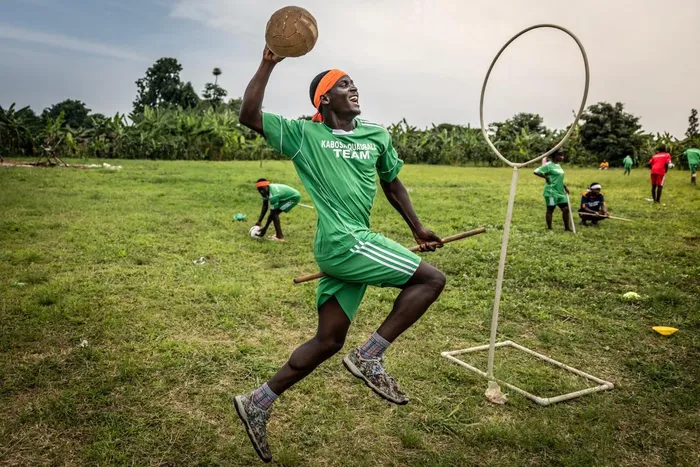 A Chaser jumps on the air to score during a training session of Quidditch, also known as Quadball, a sport inspired by the fictional game in the Harry Potter books, in the village of Katwadde, Lwengo District.